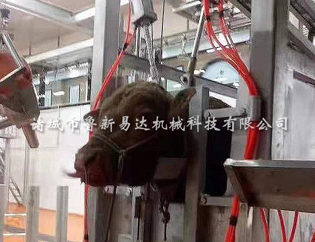 该设备由底座,圆形箱体组成。其中圆形箱体由侧门夹紧装置,背部压紧装置,液压推进装置,牛头限位装置,压牛脖装置,隔离门,传动装置,液压系统.前滚轮,后滚轮组合而成。产量30头每小时(宗教式)。